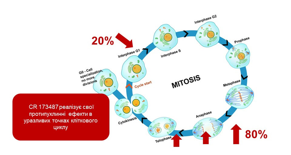 Дослідження in vitro та in vivo підтвердили, що препарат діє виключно на атипові клітини у процесі їхнього мітозу та в ході підготовки клітин до поділу. Іншими словами, CR 173487 проявляє свою цитотоксичну здатність на 80% в період метафази-телофази і на 20% — в період раннього дозрівання атипової клітини у ранній G1 фазі.